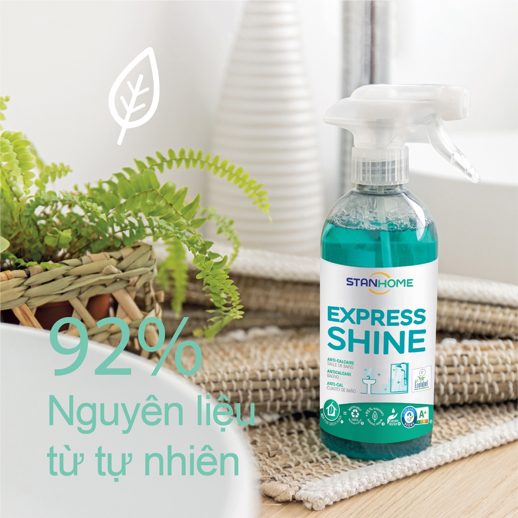 Express shine Stanhome - Xịt tẩy cặn canxi, nước cứng cho mọi bề mặt trong nhà tắm. Sản phẩm đạt chứng nhận Air label Score chỉ số A+, tốt cho không khí trong nhà và bảo vệ sức khoẻ và đạt chứng nhân Eu Ecolabel hiệu quả cao, an toàn cho sức khoẻ và bảo vệ môi trường. Với 95% nguyên liệu từ tự nhiên, công thức an toàn cho sức khoẻ. Bao bì tái chế dễ dàng cho NGÔI NHÀ THÊM SẠCH, HÀNH TINH THÊM XANH. Sản phẩm được nhập khẩu từ Pháp, sản xuất và lưu hành nội địa tại Pháp.