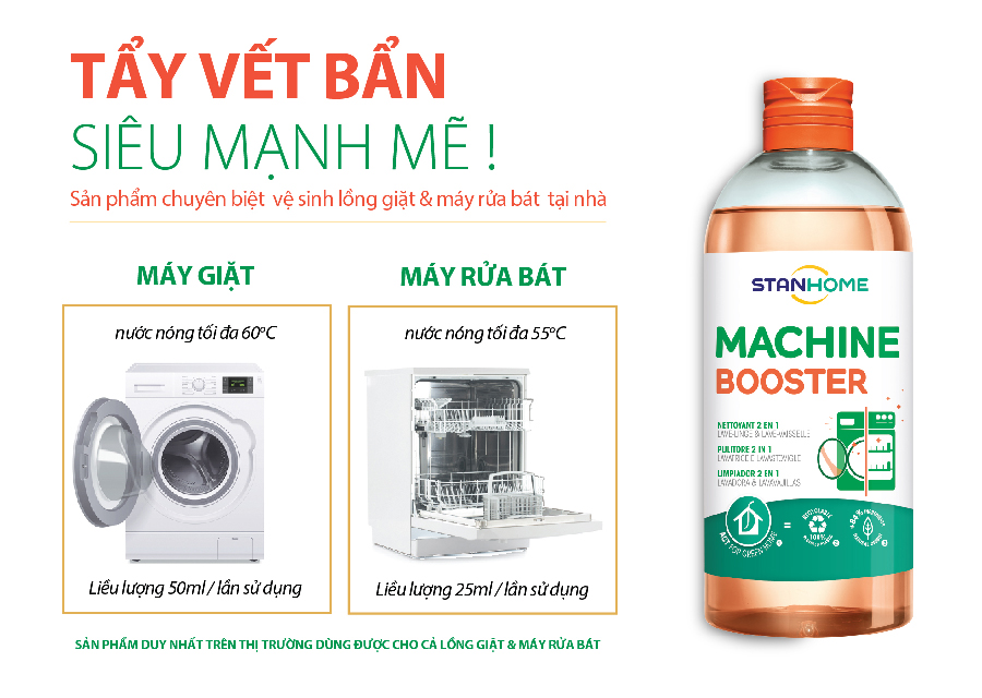 - Công việc vệ sinh máy rửa bát có khá nhiều công đoạn, bạn có thể sử dụng các hoá chất tẩy rửa chuyên dụng giúp giảm thời gian vệ sinh mà vẫn giúp máy hoạt động tốt và kéo dài tuổi thọ nhé. Bạn có thể tham khảo sản phẩm MACHINE BOOSTER - Dung dịch vệ sinh lồng giặt, máy rửa chén để máy rửa bát của bạn được vệ sinh như chuyên gia nhé.