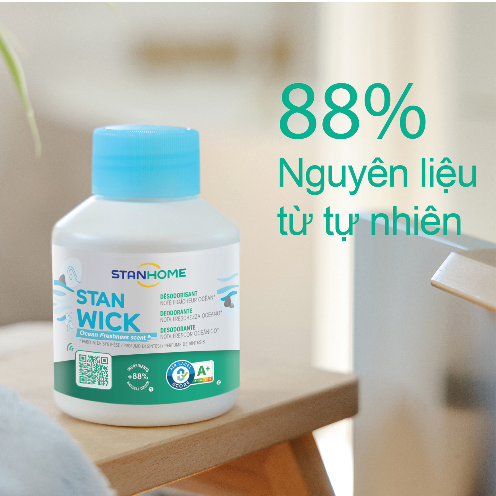 Stan Wick Ocean Stanhome -nốt hương tươi mát từ hương biển và hoa nhài, trừ khử - loại bỏ triệt để mùi khó chịu dù là cứng đầu nhất, khuếch tán hương thơm liên tục nhờ đầu bấc dày với chất liệu dệt bằng xơ chất lượng cao, mang đến làn hương tươi mát cho không gian cho không gian sống. Sản phẩm đạt chứng nhận Air label Score chỉ số A+, tốt cho không khí trong nhà và bảo vệ sức khoẻ. Với 88% nguyên liệu từ tự nhiên, công thức an toàn cho sức khoẻ. Bao bì tái chế dễ dàng cho NGÔI NHÀ THÊM SẠCH, HÀNH TINH THÊM XANH. Sản phẩm được nhập khẩu từ Pháp, sx và lưu hành nội địa tại Pháp.