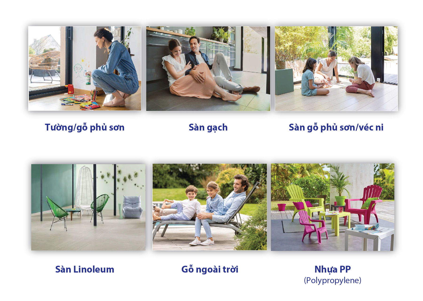 - Dùng cho cả nội ngoại thất nhà ở: tường, gỗ (phủ sơn), garage, sân thượng, ban công, sàn gạch, sàn linoleum (vải sơn lót sàn), sàn gỗ phủ sơn/véc ni, nhựa polypropylene, gỗ ngoài trời...