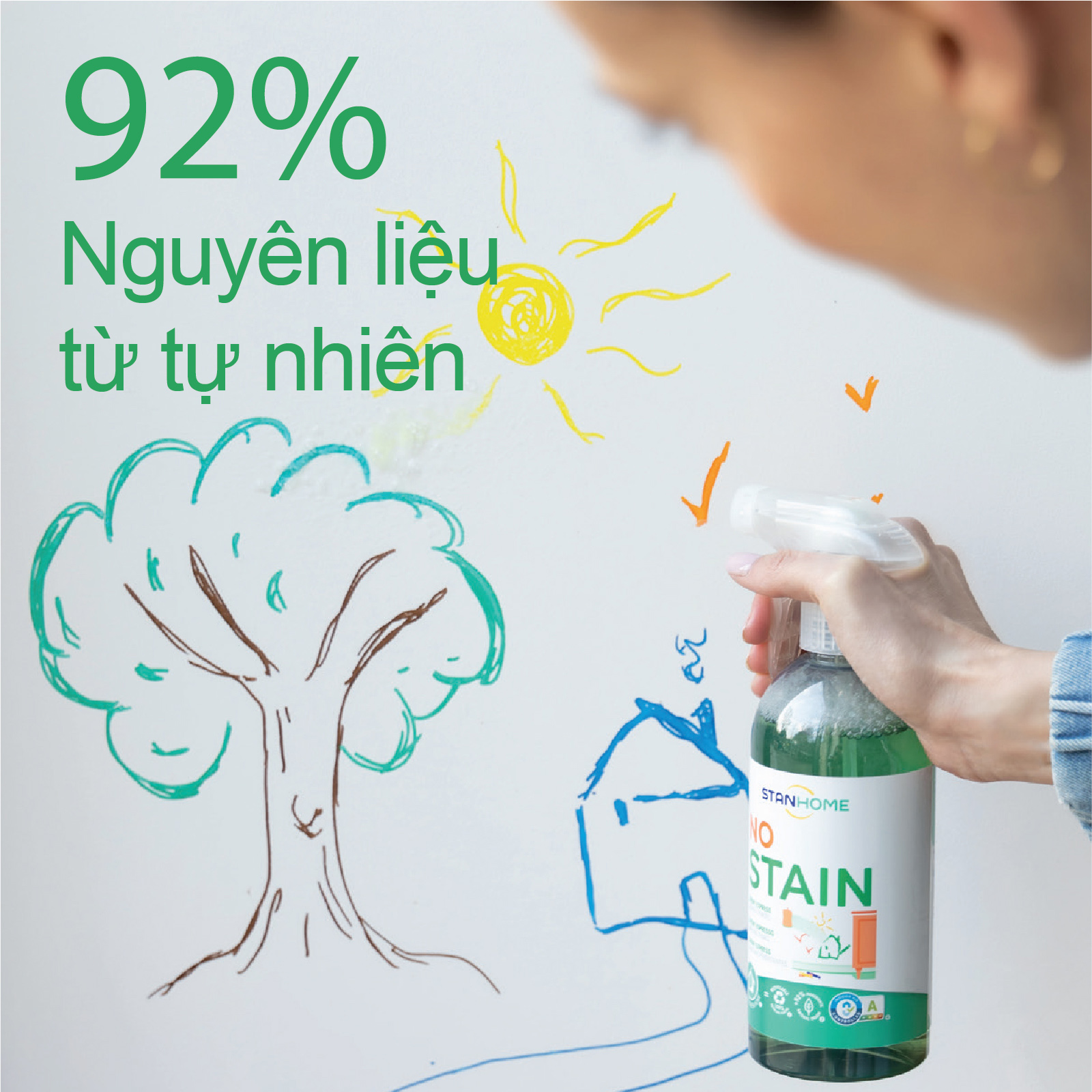 No Stain Stanhome - Xịt làm sạch loại bỏ các vết bẩn từ bút chì, chì màu, sáp màu, keo dính, cao su, tro, bụi.... trên tường, gỗ, sàn nhà nội ngoại thất...Sản phẩm đạt chứng nhận Air label Score chỉ số A, lượng khí thải ít an toàn cho không khí trong nhà và cho sức khoẻ. Với 92% nguyên liệu từ tự nhiên, công thức an toàn cho sức khoẻ. Sản phẩm được nhập khẩu từ Pháp, sx và lưu hành nội địa tại Pháp.